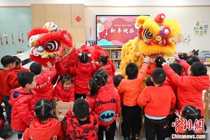 1月3日,新城时光幼儿园,小朋友们与舞狮互动。中新网记者 何蓬磊 摄