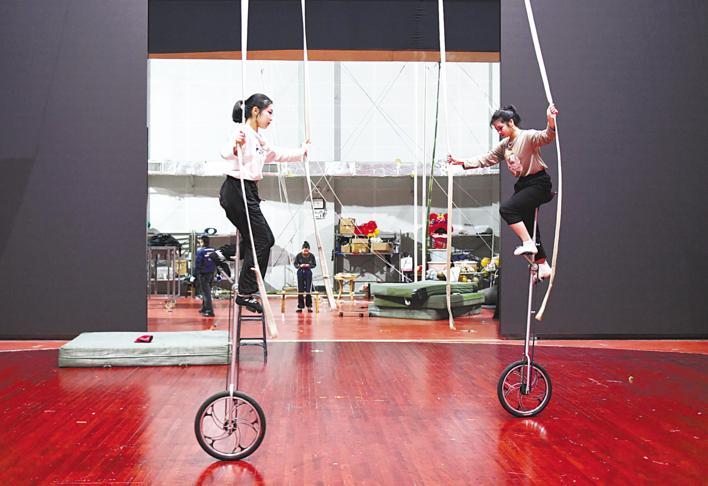 2023年11月29日,杂技演员在练习骑独轮车技艺。