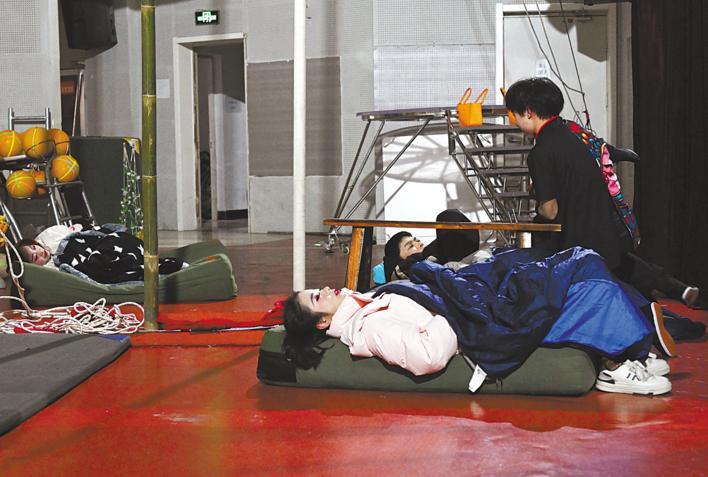 2023年11月30日中午,几名演员在舞台后的垫子上小睡,准备下午演出。