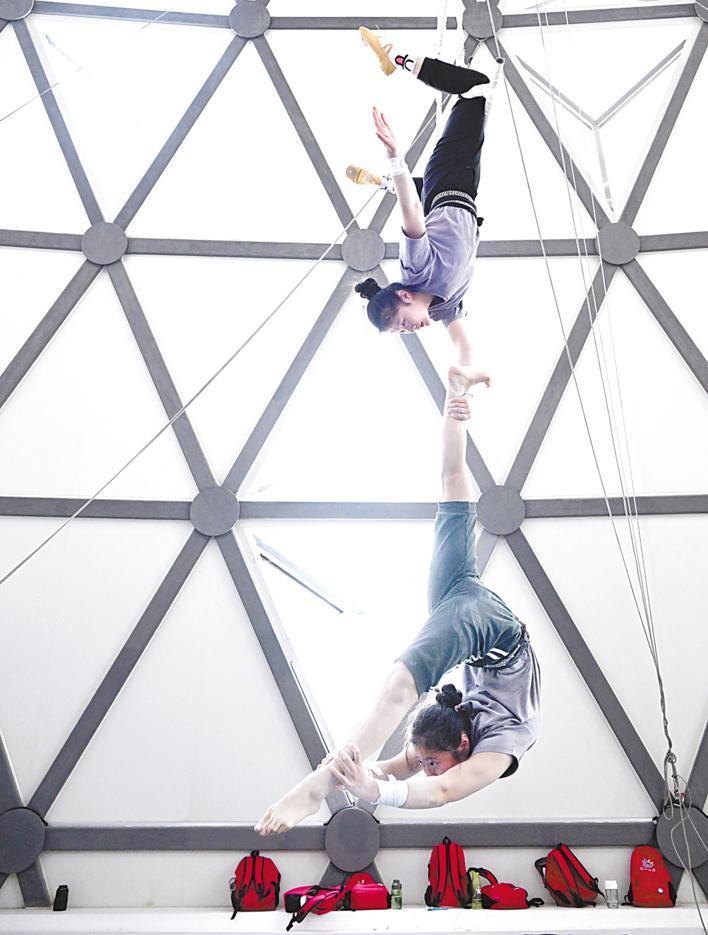 腰接、肘接、翻腾……悬空8米的吊子上,15岁的刘馨琪与搭档徐杨倩正在排练《双人吊子》节目,两位杂技“小花”幻化为轻盈的鸟儿,在高空中演绎一系列惊险动作,看得人眼花缭乱、惊心动魄。该节目去年亮相莫斯科尼库林国际马戏节,斩获大赛银奖。