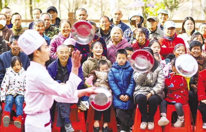 2023年12月3日,浠水县洗马镇堰桥村,杂技演员的精彩表演让村民开怀大笑。