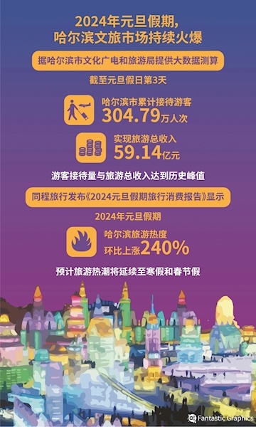 今年元旦假期,哈尔滨市文旅市场持续火爆,累计接待游客超300万人次,实现旅游总收入59亿余元,双双创下该市历史纪录。(据1月3日光明网)