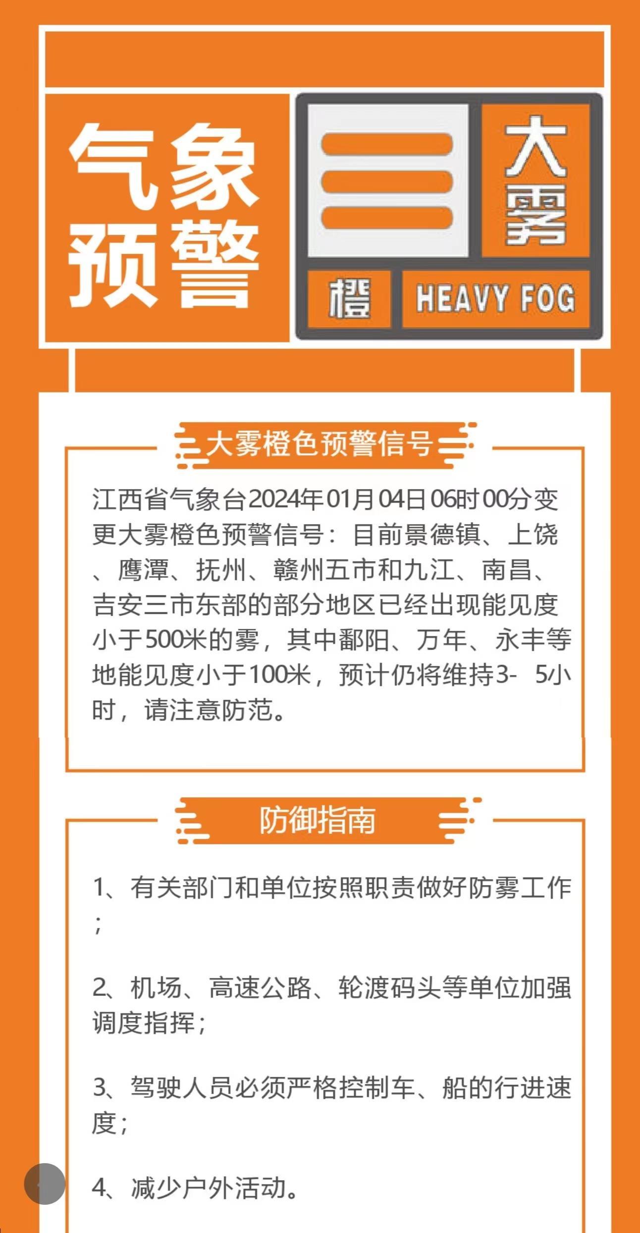 1月4日早晨6时,江西省气象台变更大雾橙色预警信号:目前景德镇、上饶、鹰潭、抚州、赣州五市和九江、南昌、吉安三市东部的部分地区已经出现能见度小于500米的雾,其中鄱阳、万年、永丰等地能见度小于100米,预计仍将维持3-5小时,请注意防范。