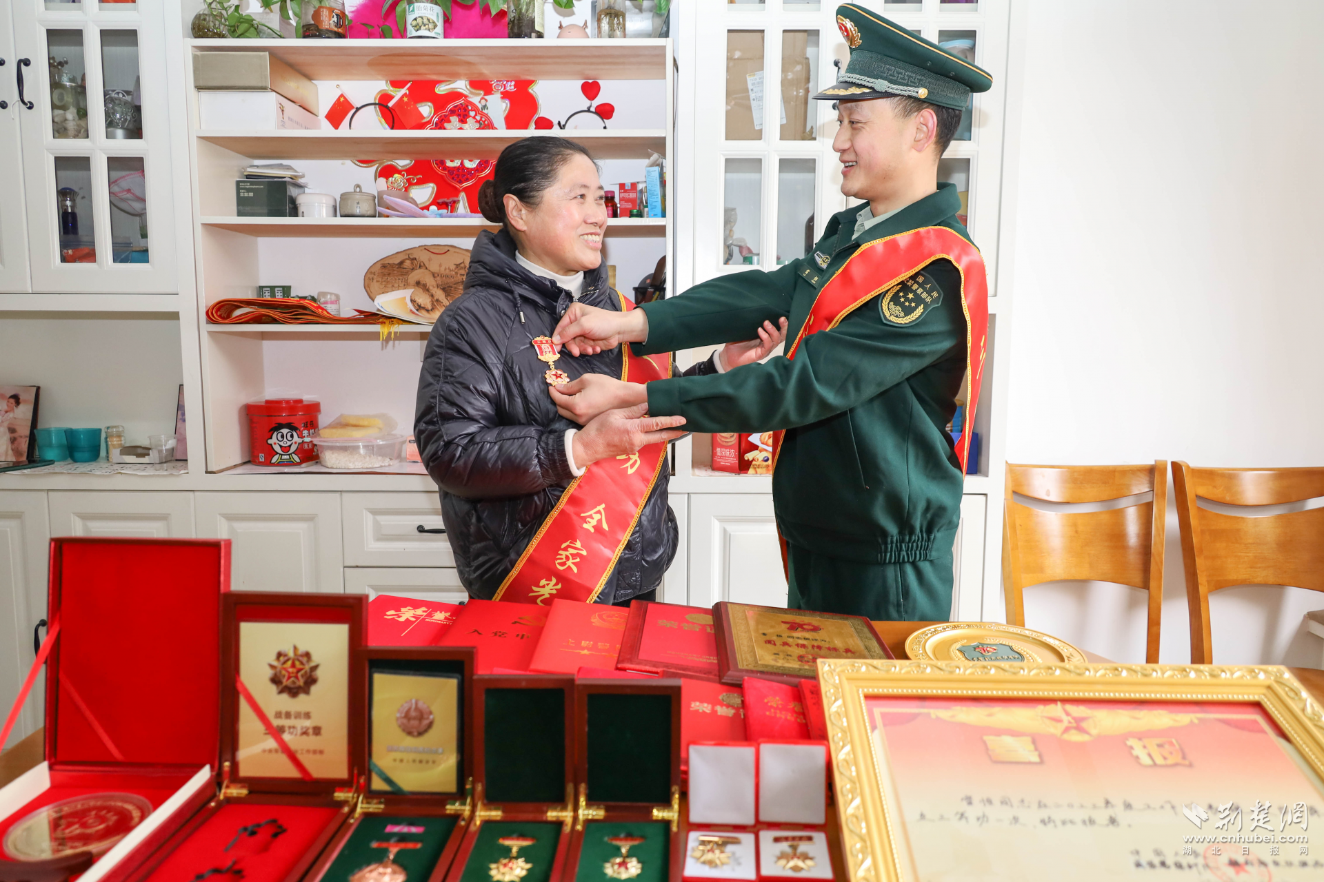 “妈妈,这枚军功章我给你挂上,感谢您对我们这个家庭的付出。”在家休假的现役军人雷恒家中,雷恒为母亲张立芳佩戴三等功军功章,与母亲分享荣誉。一人当兵,全家光荣。一人受奖,全家荣誉。