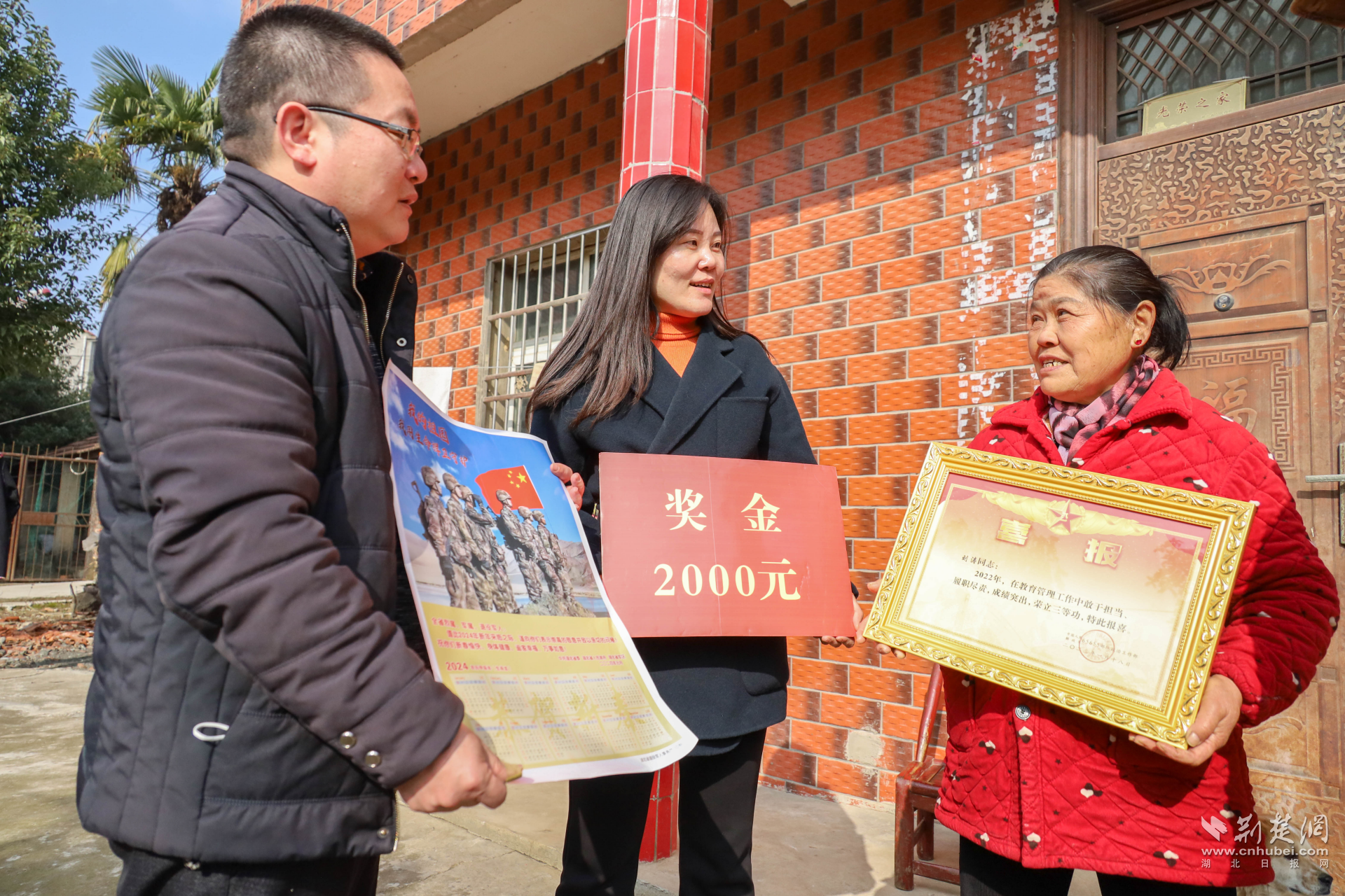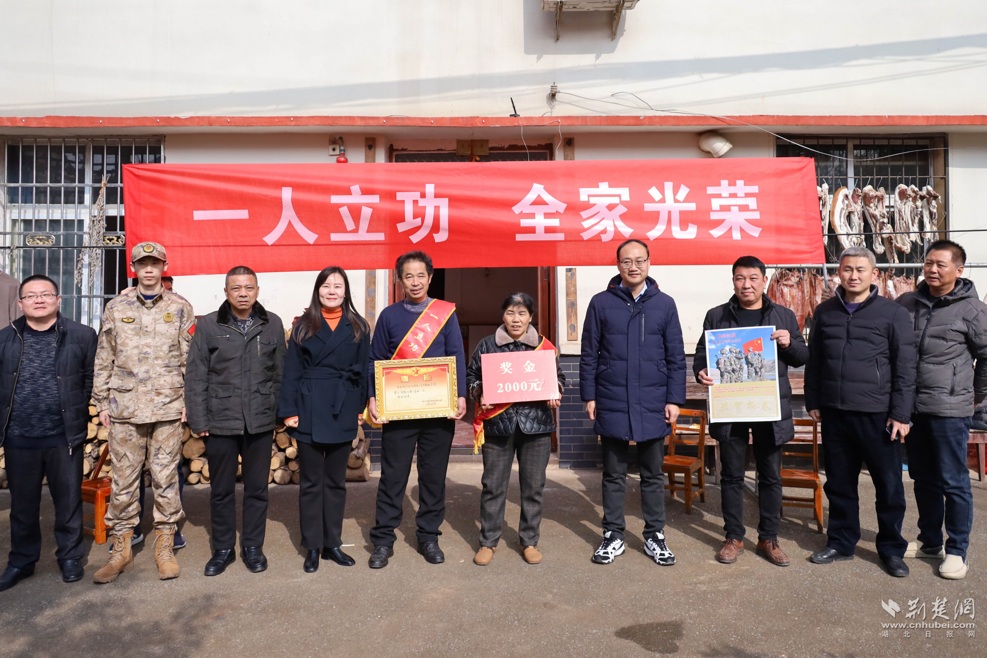 荆楚网(湖北日报网)讯(通讯员舒威)为弘扬拥军优属光荣传统,营造尊崇军人的良好社会氛围,1月3日,武汉市江夏区人武部联合区退役军人事务局、江夏经济开发区退役军人服务站、纸坊街道退役军人服务站、山坡街道退役军人服务站为雷恒、徐洋、鲁铭等5名现役军人家庭送去立功喜报和慰问金,并送上党和政府对立功军人家属的关怀和问候。