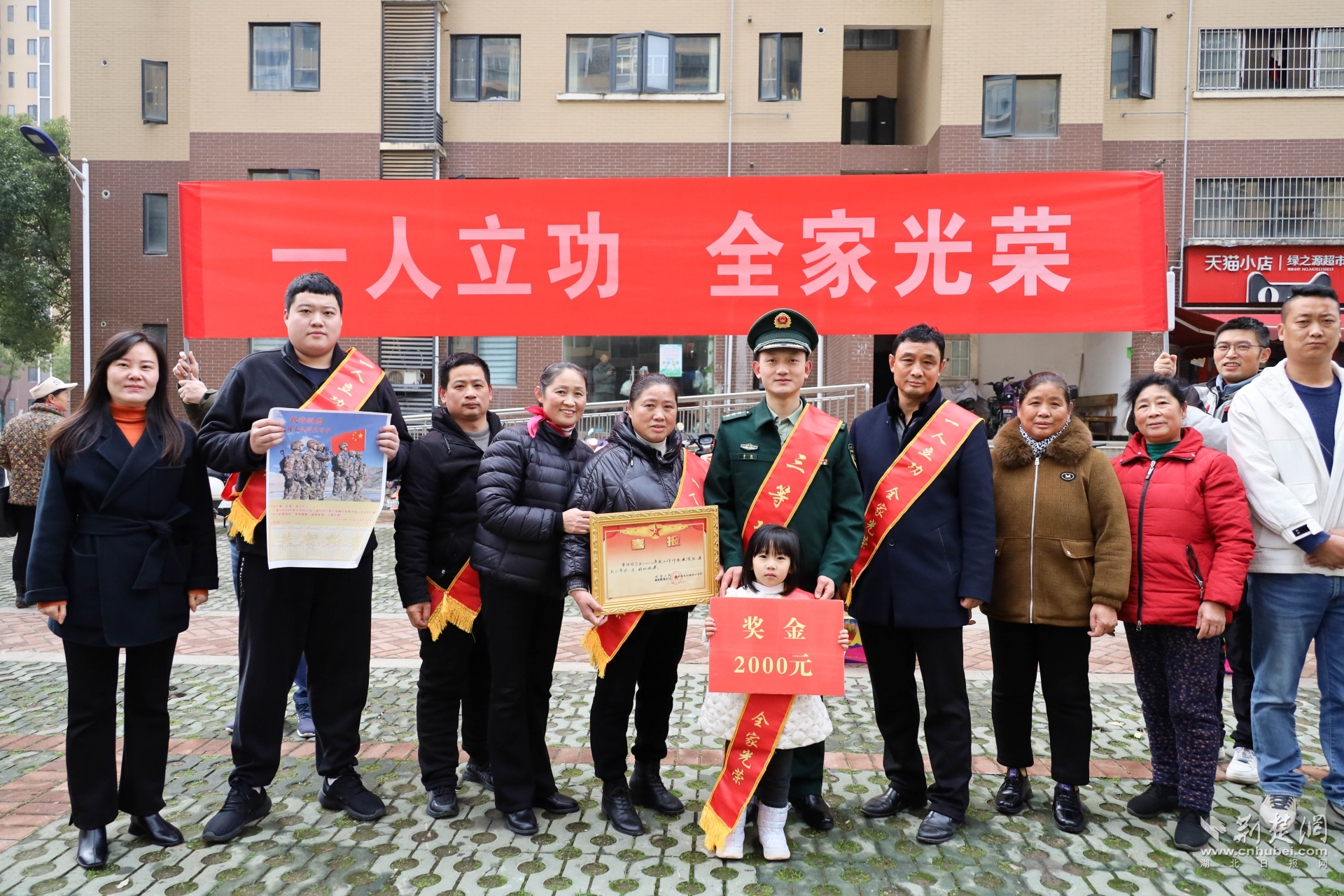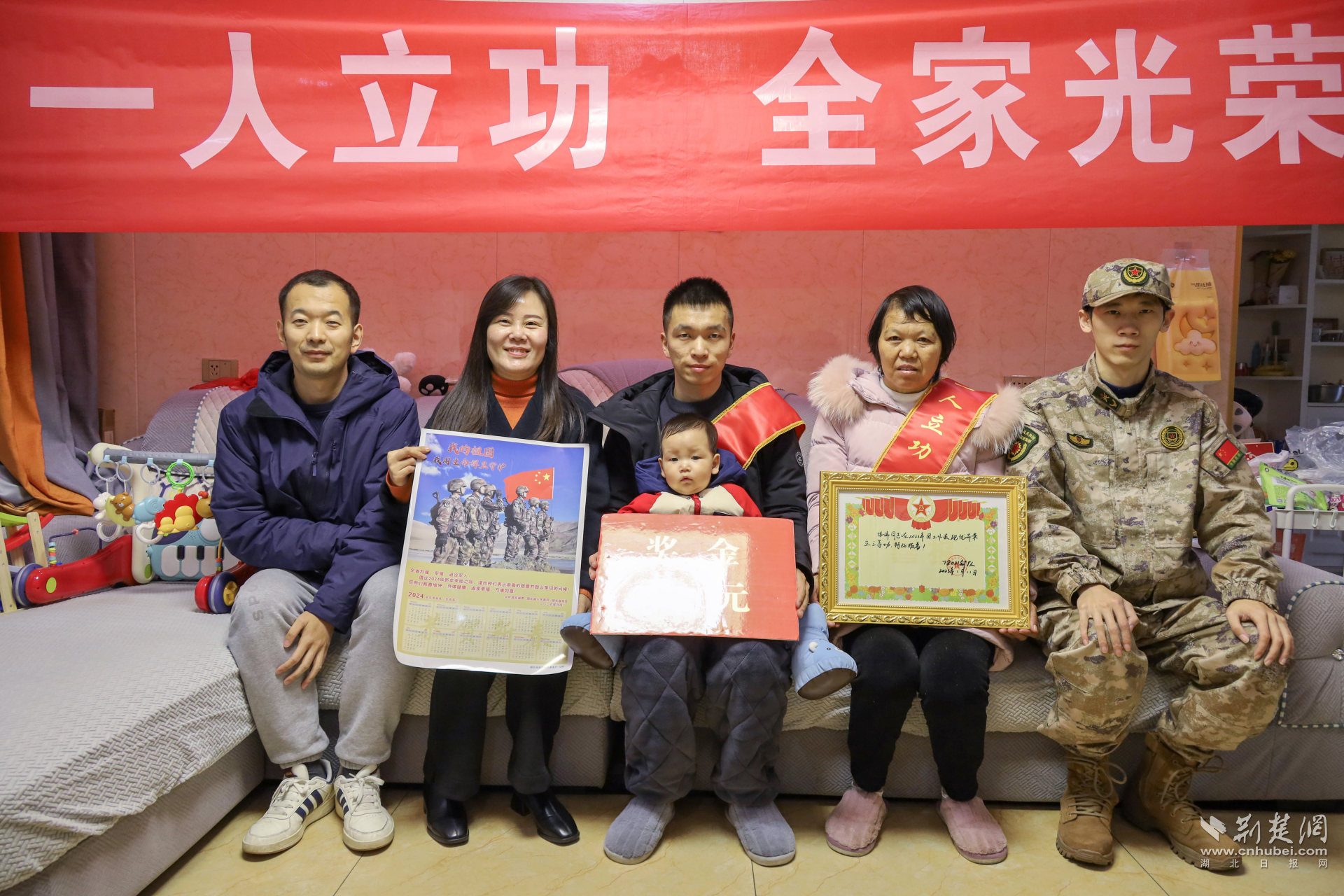 “小泽泽,这是你爸爸的三等功喜报,长大后奶奶也送你去部队当兵啊!”纸坊街现役军人徐洋母亲抱着孙子徐天泽开心地说道。