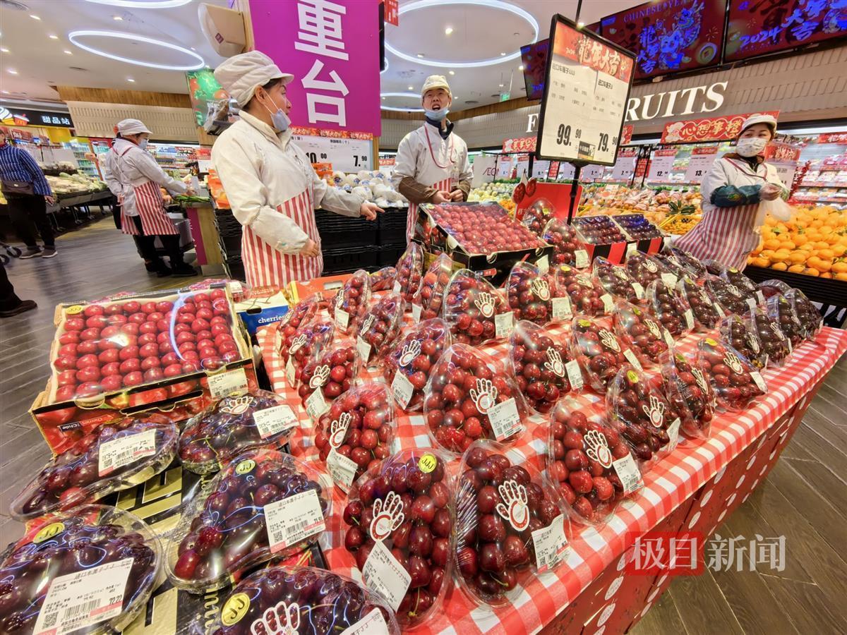 1月4日上午,当记者来到汉口兴业路的一座大型连锁超市时,水果区里的工作人员正在将分装完毕的车厘子进行码堆,同时更换了新的价签。
