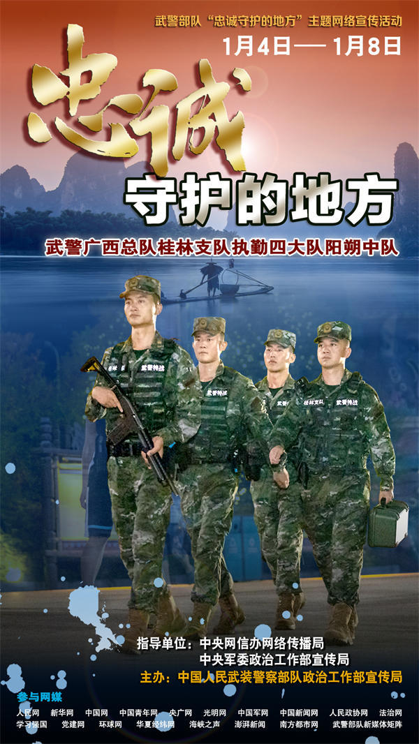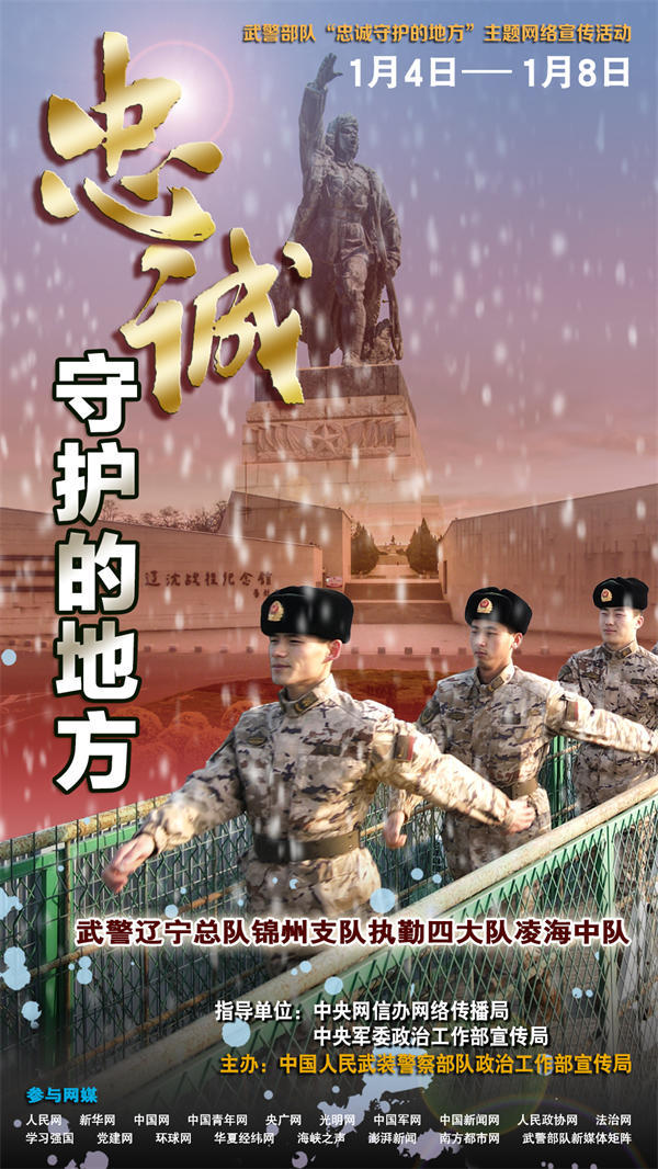 人民网北京1月4日电 (陈羽)万家灯火有我守护,平凡哨位书写忠诚。无论北疆雪原还是南域海岛,无论繁华都市还是大漠荒滩,祖国各地到处都有武警官兵站哨执勤的身影、到处都是他们忠诚守护的地方。为真实反映新时代武警部队忠诚担当使命、守卫社会安宁的坚强决心和坚定行动,立体展现“人民武警爱人民、人民武警为人民”的宗旨情怀,近期,在中央网信办网络传播局和中央军委政治工作部宣传局指导下,武警部队政治工作部宣传局策划组织了“忠诚守护的地方”主题网络宣传活动,集中对武警辽宁总队锦州支队执勤四大队凌海中队、广西总队桂林支队执勤四大队阳朔中队、海南总队儋州支队执勤三大队执勤六中队、陕西总队铜川支队执勤一大队等4个先进基层单位,进行面对面采访和网络化报道。