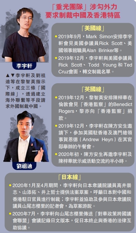 控方表示,黎智英在案发时是“重光团队”的主脑及“金主”角色。2019年8月,“港独”分子李宇轩、刘祖迪等人成立“重光团队”。控方描述,黎智英及Mark Simon(黎智英助理)是组织幕后主脑,负责最高指挥及财政支援。其中,Mark Simon向黎智英汇报,由黎智英批核大额资助,而较低金额的款项则由Mark Simon批核。陈梓华是组织中间人,负责向李宇轩及刘祖迪传达黎和Mark Simon指示。李宇轩及刘祖迪则为“重光团队”的表面人物。众人利用“重光团队”,透过登报、发起众筹、建立海外联系等手段请求外国制裁中国。李宇轩、陈梓华及刘祖迪在黎智英指示下,与美、英、日三国政客联系,成立3条“国际线”。