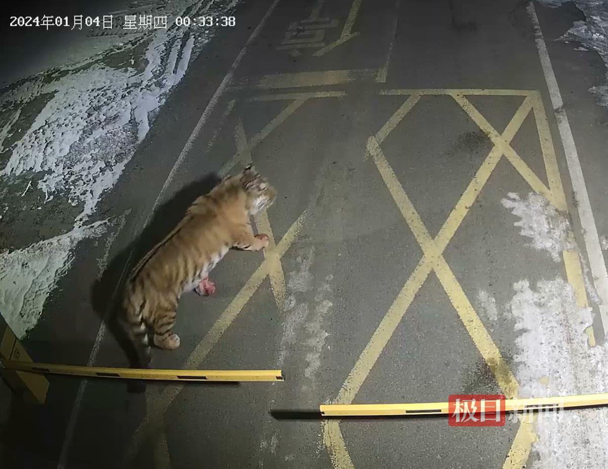 两段监控视频显示,1月4日0时33分,在一矿区门口的机动车道上,一只老虎缓缓踱着步子,从远处走来。待它走至摄像头底下,可以清晰地看到,其前爪还有明显的血迹。监控视频还显示,记录这一过程的是“厢房警务室235”号摄像头。