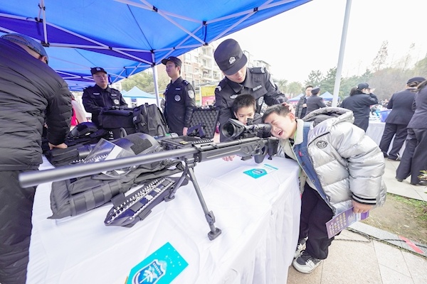 1月6日,武汉市公安局武昌区分局走进南湖街道华锦社区,举办了丰富有趣的警营开放日活动。民警们为小区居民免费书写春联、普及禁毒知识、进行反诈宣传、展示警用装备等,受到热烈欢迎。图为孩子们在狙击步枪展台前进行体验。 楚天都市报极目新闻记者肖颢 吴昌华 通讯员孙逊 董兴龙摄影报道