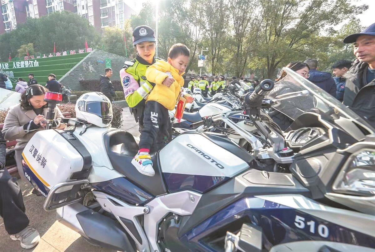 交通民警带来了高大威猛的汉警快骑摩托车。平时一闪而过、“只可远观”的汉警快骑摩托车,现在近在咫尺,几名孩子发出“哇”的惊呼。看到孩子们渴望的眼神,交警警花把他们抱上摩托车,家长高兴地举起手机拍照。