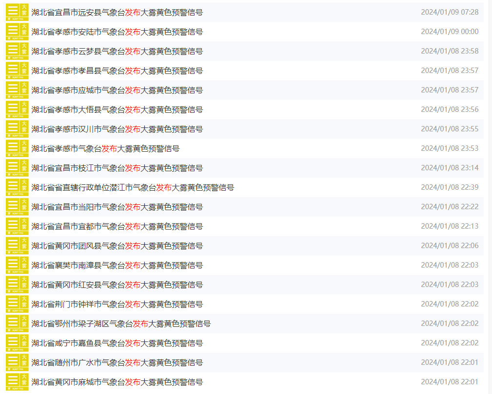 昨天夜间至今天白天,湖北连发64条大雾黄色预警信号:预计8日夜间至9日上午,除十堰、神农架、恩施外,我省大部地区将出现能见度小于500米,局部小于100米的雾,请注意防范。