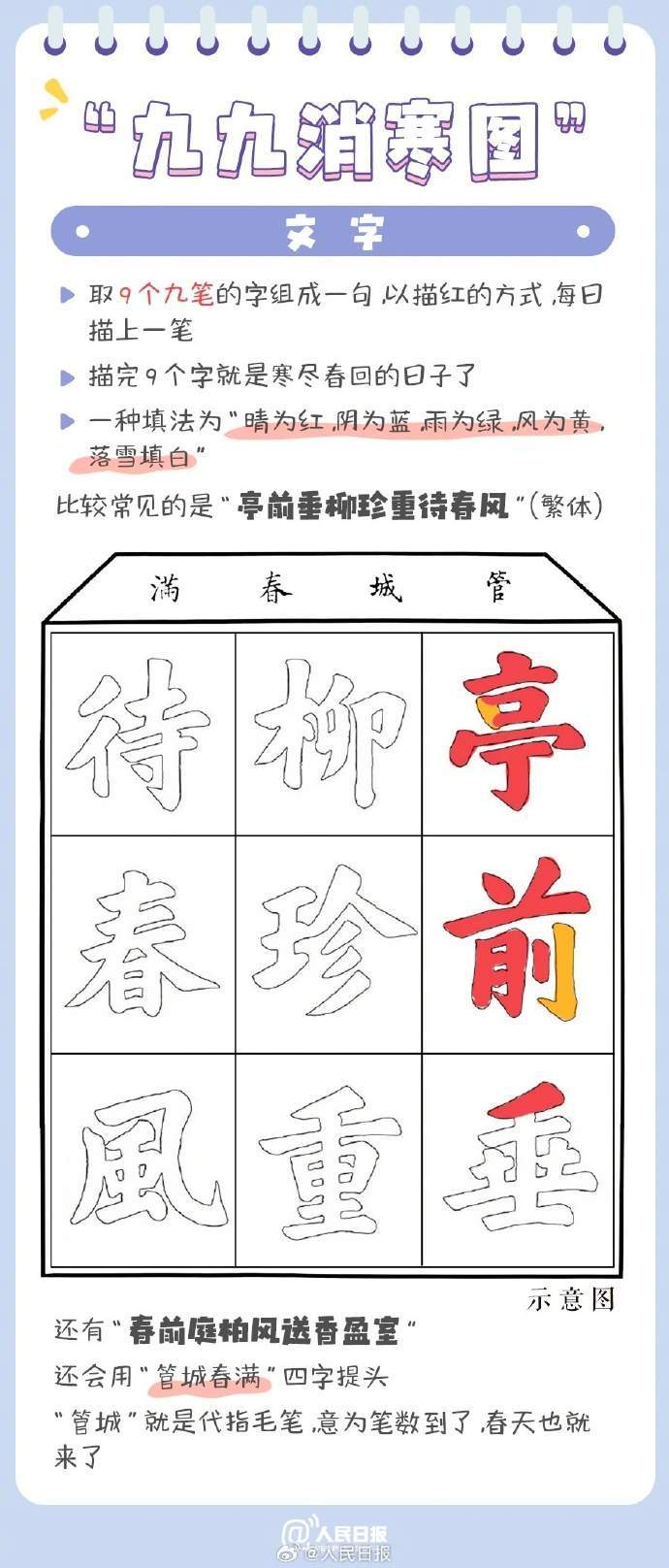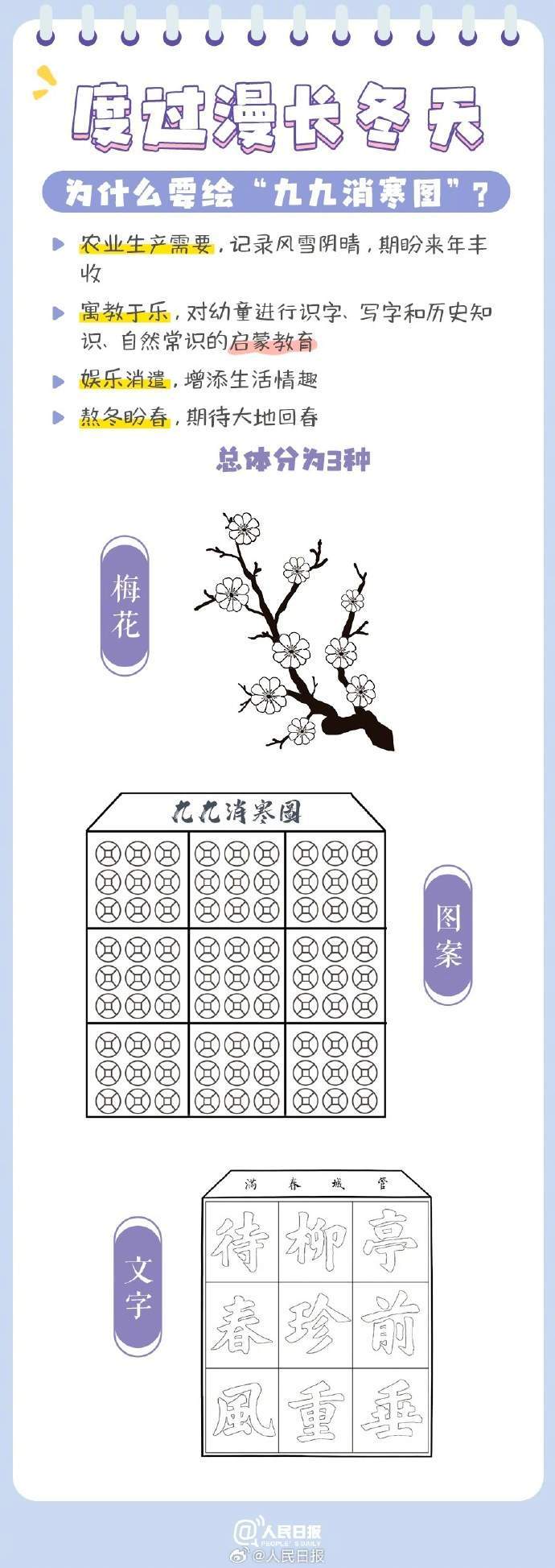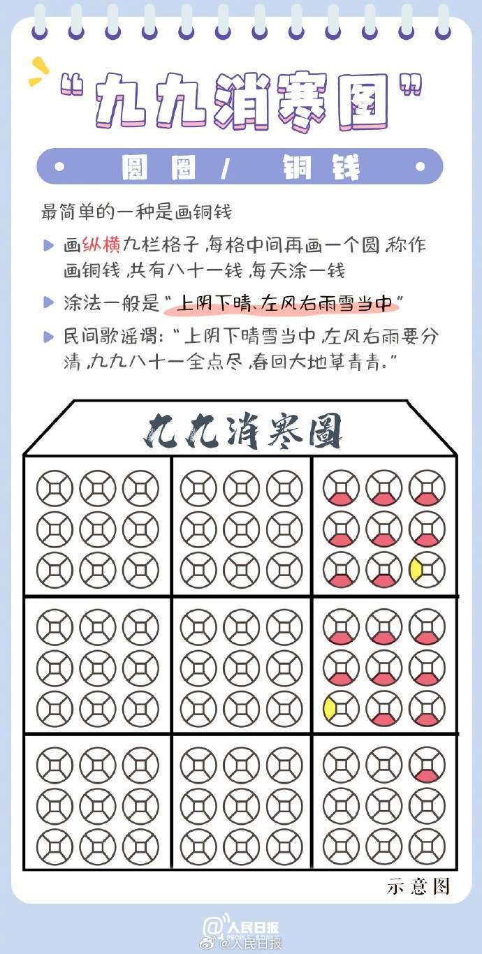 自古以来,我国民间就有“数九”习俗,从冬至起,每九天算一“九”,今天正是“三九”第一天。人们还用填图、写字等方式,填充数九时期的日历,这就是“九九消寒图”。戳图,看古人如何“数九”,愿你温暖过冬,共盼春回大地!