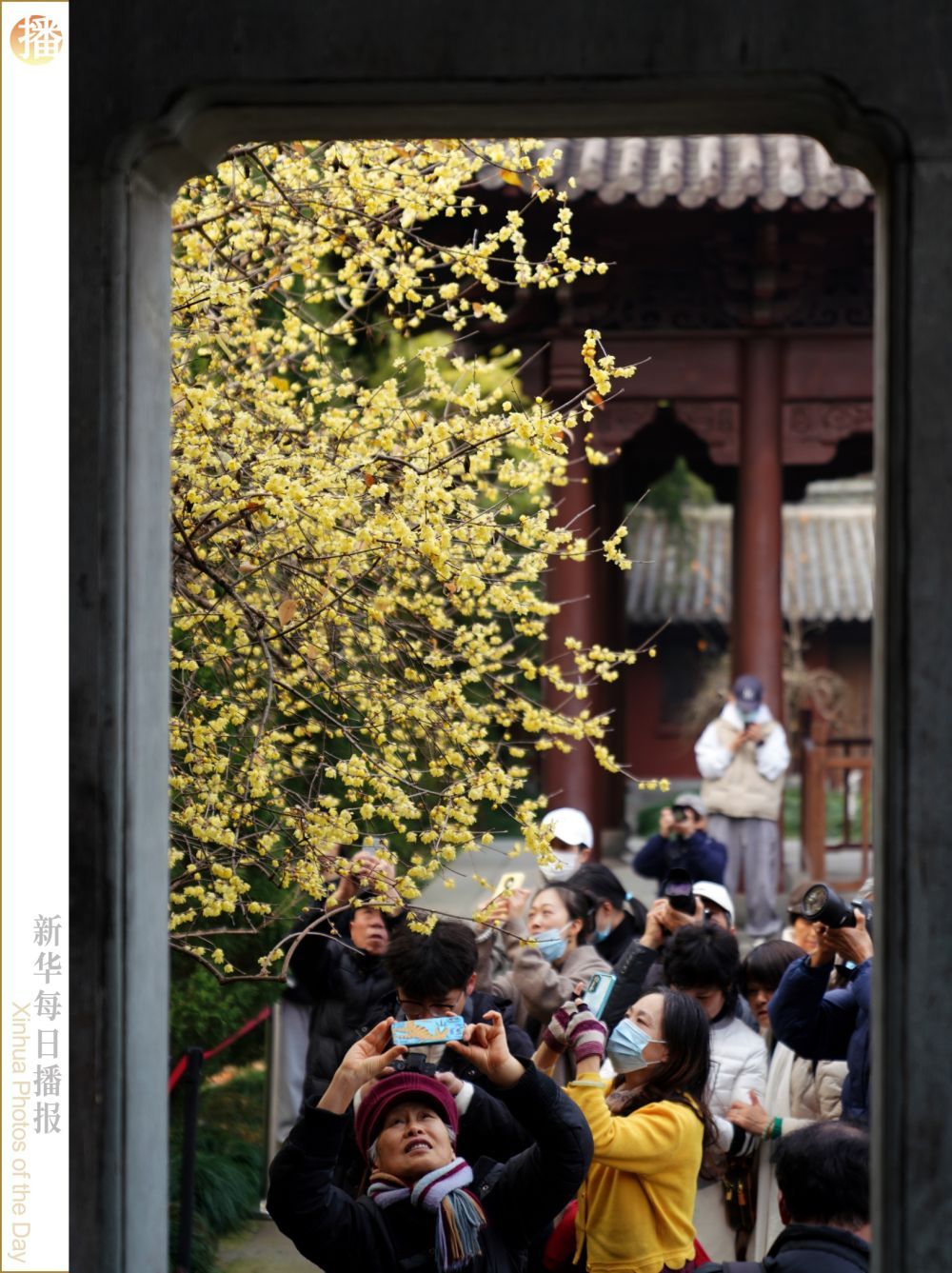 1月9日,人们在钱王祠内观赏、拍摄腊梅。近日,杭州西湖边钱王祠内腊梅盛放,吸引市民游客前来观赏。