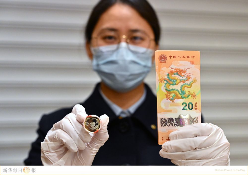 1月9日,中国建设银行北京兴融支行的工作人员展示2024年贺岁双色铜合金纪念币和纪念钞。当日,由中国人民银行发行的2024年贺岁双色铜合金纪念币和纪念钞开始兑换。双色铜合金纪念币面额10元,发行数量1.2亿枚;纪念钞面额20元,发行数量1亿张,纪念币和纪念钞均采取预约兑换方式发行。