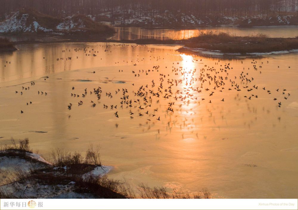 1月9日,在内丘县汦河拍摄的水鸟(无人机照片)。冬日里,不少野生鸟类汇聚在河北省内丘县汦河畔,时而高空盘旋,时而漫步觅食,与朝霞相映成趣,构成一幅美丽的画卷。