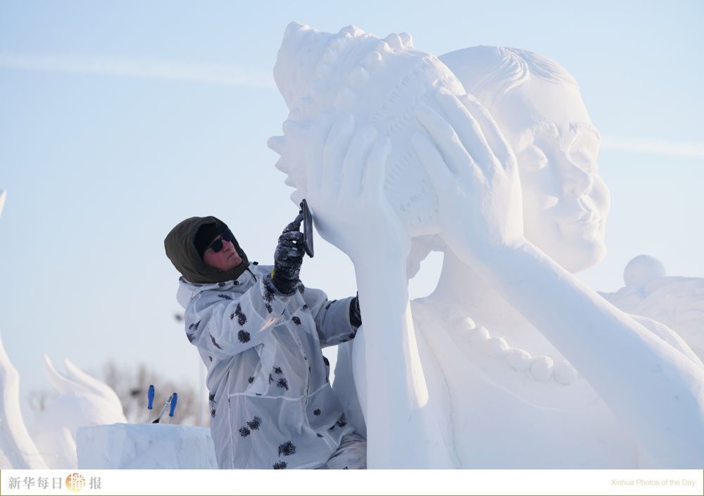 1月8日,参赛选手在进行雪雕创作。当日,在哈尔滨太阳岛雪博会园区内举行的第26届中国·哈尔滨国际雪雕比赛进入第三天的赛程。