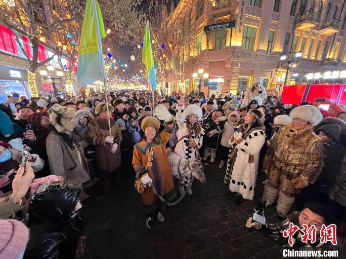 图为“中国最后一支使鹿部落”在哈尔滨中央大街吸睛。根河市委宣传部供图