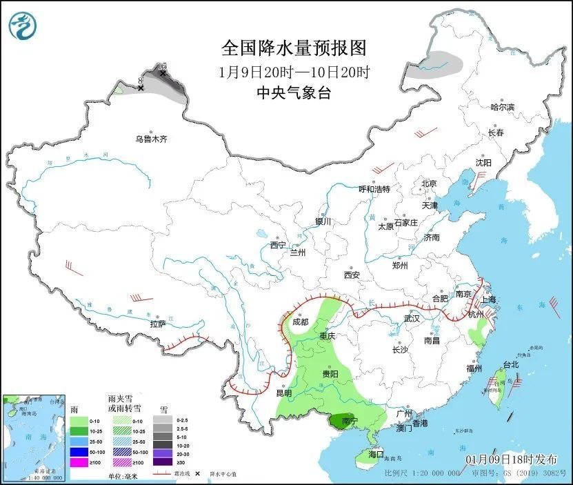 1月9日20时至10日20时,内蒙古东北部、新疆北疆北部等地部分地区有小到中雪或雨夹雪,其中,新疆北部塔城、阿勒泰地区有大到暴雪。浙江南部、四川盆地东部、云南东部、贵州中西部、广西大部、海南岛、台湾岛东部等地部分地区有小到中雨。