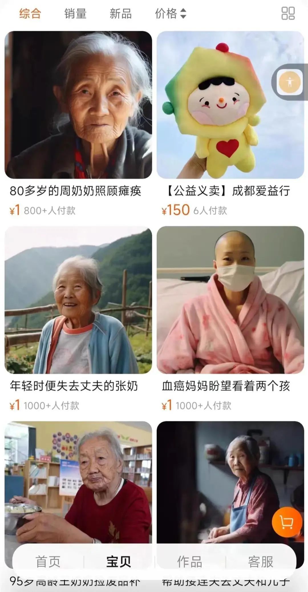 相关链接显示,店铺名称为成都爱益行公益服务中心,商品名称为“80多岁的周奶奶照顾瘫痪的老伴、女儿又得重病,帮她筹生活补助”,首页使用了三张照片,其中两张为一名老人的面部特写照片,一张为老人背面的照片。