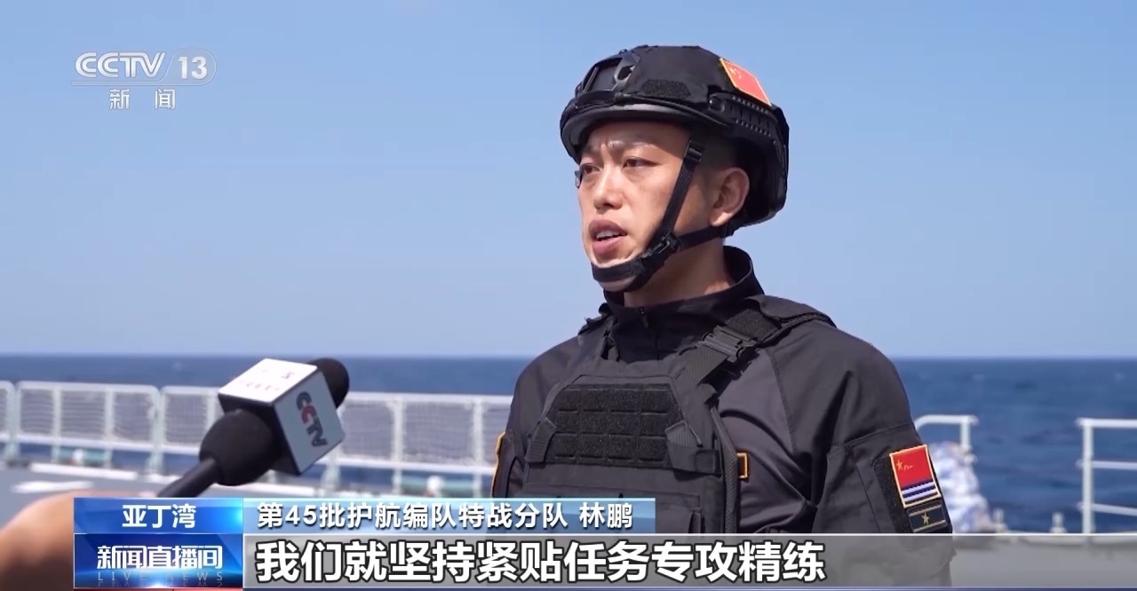 第45批护航编队特战分队 林鹏:新年度开训伊始,我们就坚持紧贴任务专攻精练,加大舰艇攀爬、舱室搜索、实弹射击等课目训练力度、强度和难度,不断锤炼特战分队应对复杂形势、处置突发情况的能力。