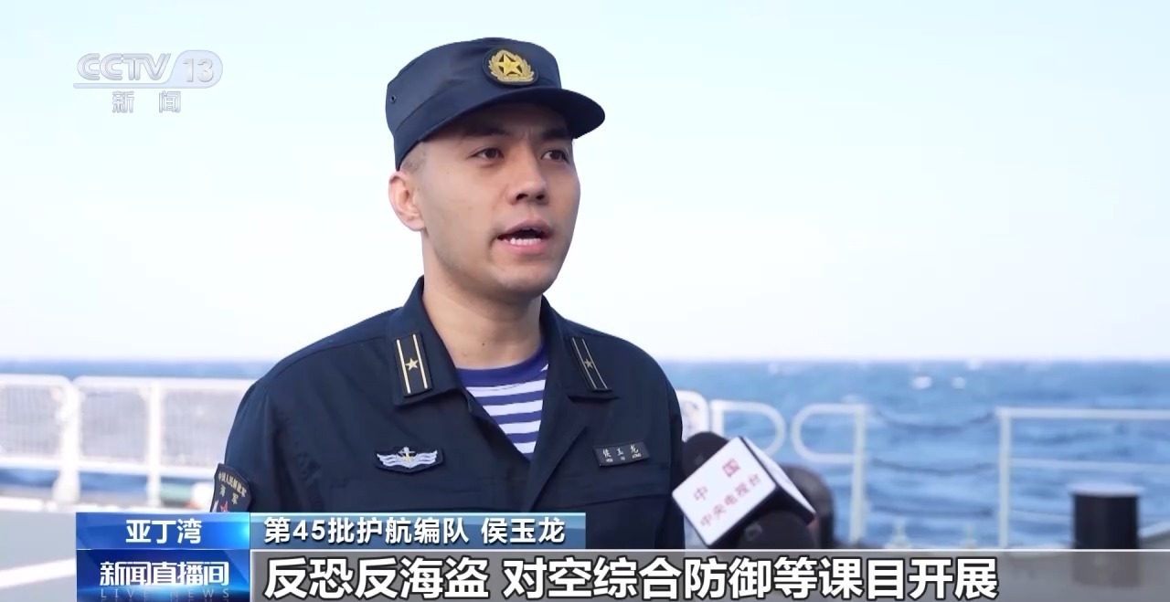 第45批护航编队 侯玉龙:此次训练我们重点围绕反恐反海盗、对空综合防御等课目开展,检验完善了武力营救、反劫持等多种方案预案,有效提高编队应对多种安全威胁、完成多样化军事任务能力。
