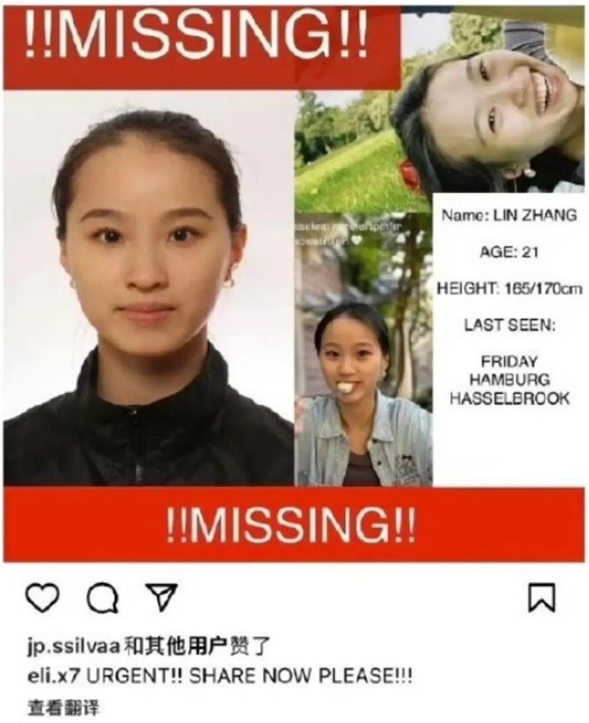 寻人启事显示,一名叫张琳的21岁中国女士,在德国汉堡失踪,最后一次出现是当地时间1月5日下午2点左右。一舞蹈博主称,张琳失联的情况属实,“而且她在汉堡这段时间工作生活状态都非常正常,演了新剧新角色,突然无故失联是非常可怕的情况。”