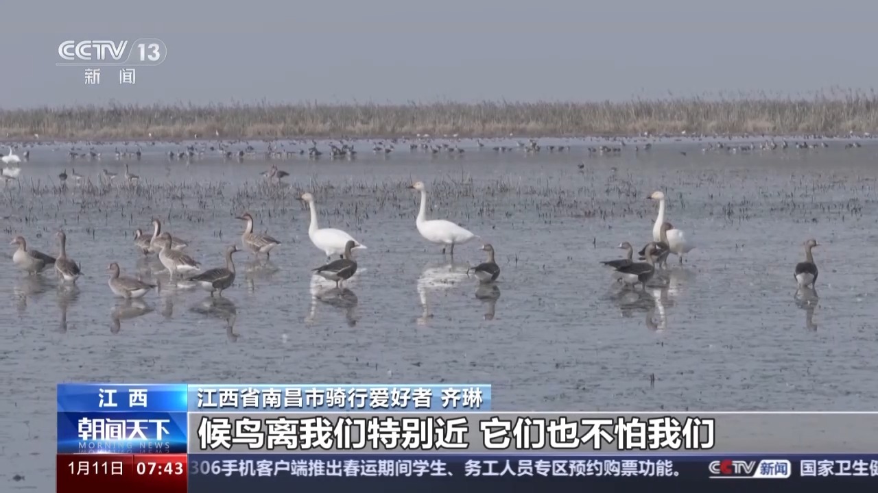 江西省南昌市骑行爱好者 齐琳:我们一共有十多个人,从南昌到这边大概有70多公里,候鸟离我们特别近,它们也不怕我们,给我的感觉,就是人与自然非常和谐相处的一种状况。