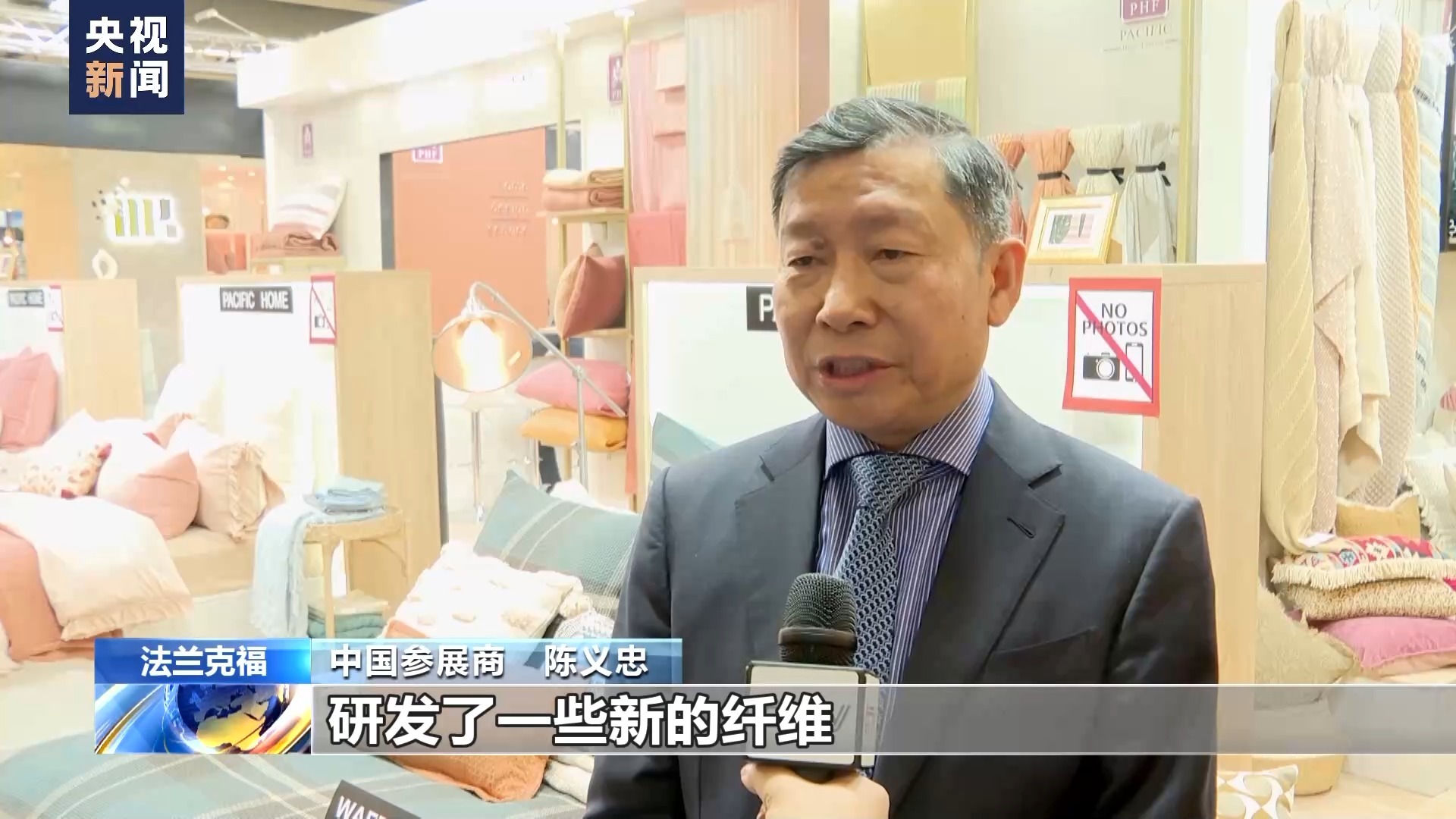 中国参展商 陈义忠:中国企业现在一方面是自身的研发,同时进行产学研合作,特别是和纺织大学合作,建立了大量的实验基地、研发中心和研究院,研发了一些新的纤维,这就是我们中国企业目前参与竞争的优势。