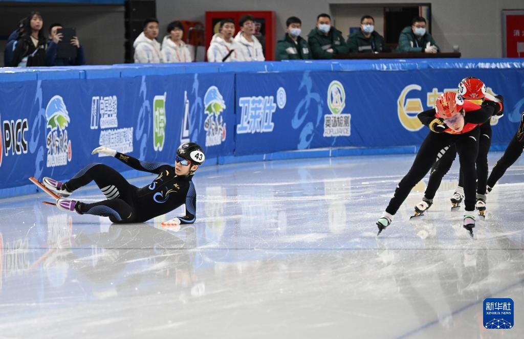 1月11日,湖北队选手孔伟琪(左一)在女子1500米四分之一决赛中摔倒。新华社记者 连振 摄