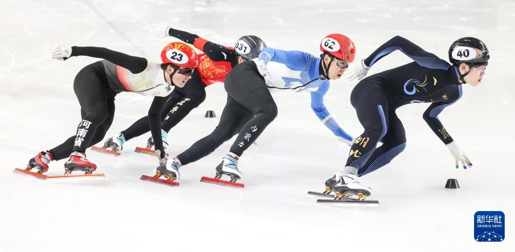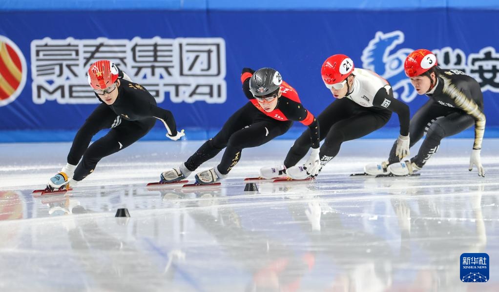 1月11日,湖北队选手王天佑、内蒙古队选手吴世强、黑龙江队选手田珉硕、河南队选手李禹衡(从右至左)在男子1500米四分之一决赛中。新华社记者 王楷焱 摄