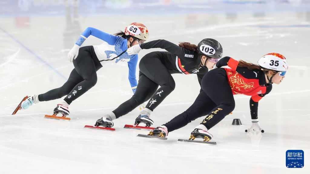 1月11日,黑龙江队选手杨婧茹、天津队选手侯雨茗、内蒙古队选手赵嘉诺(从右至左)在女子1500米四分之一决赛中。新华社记者 王楷焱 摄