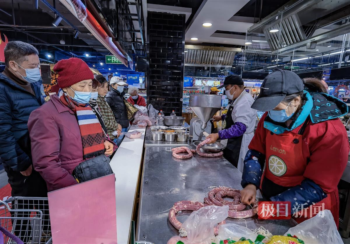 同样热闹的场景也出现在汉口武胜路、崇仁路、集贤路一带的街头。当前年货生意最火爆的当数灌制腊肠、炸圆子等现场制作的“年味”,市场上的竞争也愈加激烈。