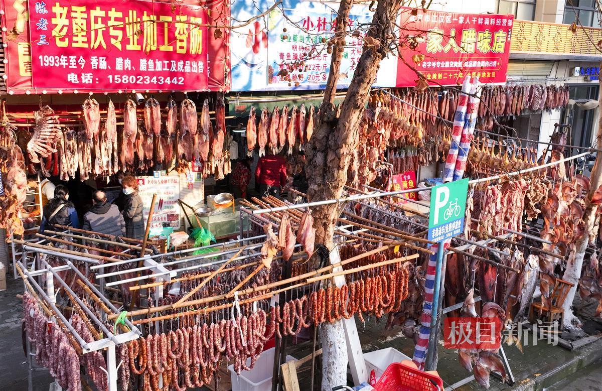 “这两年,每到春节前一个月,就会专门到这里来打年货。”家住汉口后湖的市民黄先生驱车来到这座府河边的大晒场,给家人采购了4条大草鱼腌制的腊鱼,6刀腊肉、3只腊鸭和20斤腊肠:“我们组团来打年货,都是给一大家子人采购回去。”