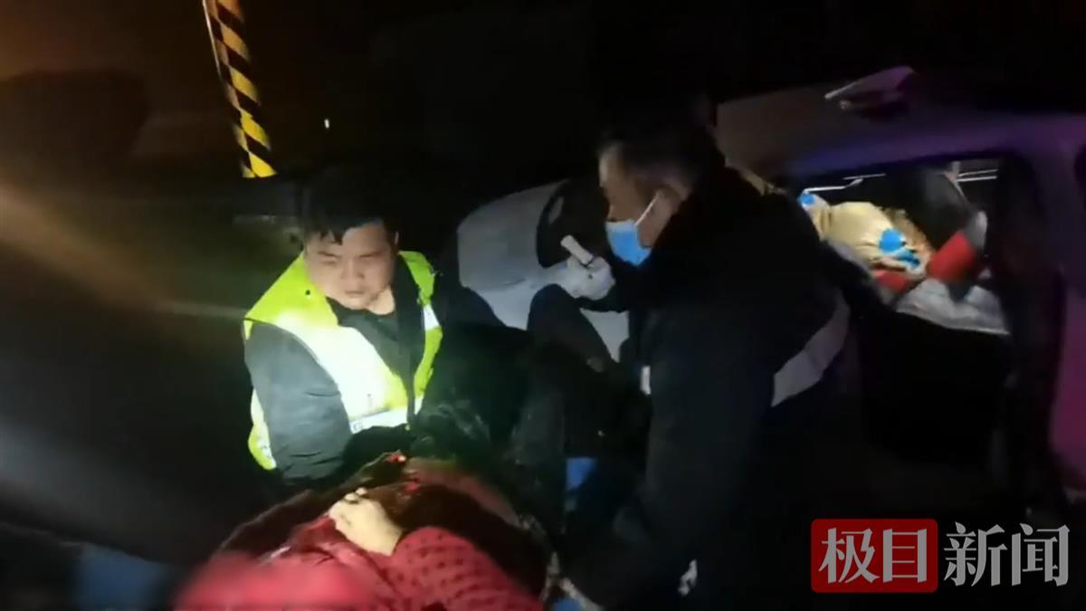 凌晨,漆黑的高速公路上,一辆小车追尾撞上一辆大货车,坐在副驾驶座位的女子受伤,动弹不得。湖北高速交警闻讯紧急赶来,救出伤者,送上救护车。