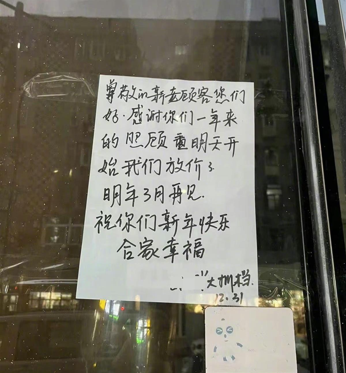 餐厅在玻璃门上贴出的通知落款时间为12月31日,称:“尊敬的新老客户你们好,感谢你们一年来的照顾。明天开始我们放价(假)了,明年3月再见……”有合肥当地博主将该通知发出后,引来不少网友的羡慕。也有人表示,这个餐厅会不会开在大学城附近,学生们正好放假了。还有人称,这家餐厅会不会生意本来就不太好?对此,博主表示,这家餐厅是合肥当地比较有名的一家大排档,生意不错,并且开在市中心,不在大学城。