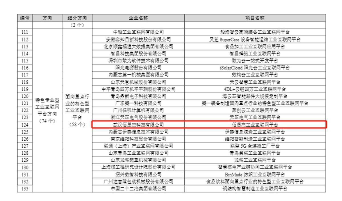 湖北3个项目入选“特色专业型工业互联网平台方向”,分别是:武汉佰思杰科技有限公司的“佰思杰工业互联网平台”项目、中核武汉核电运行技术股份有限公司的“中国核电工业互联网平台(DHP)”项目、武汉益模科技股份有限公司的“益模工业数字化智造云平台”项目。