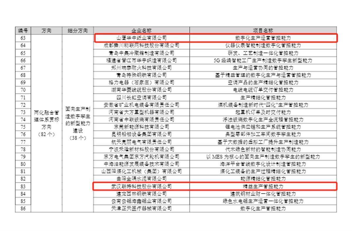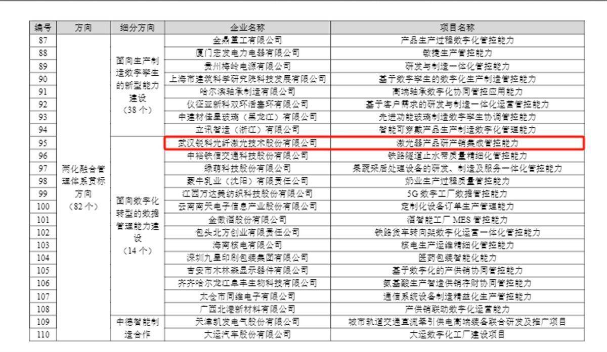 梳理名单,湖北4个项目入选“两化融合管理体系贯标方向”,分别是:骆驼集团股份有限公司的“基于数字化的研产销回一体的供应链新型能力”项目、山鹰华中纸业有限公司的“数字化生产运营管控能力”项目、武汉联特科技股份有限公司的“精益生产管控能力”项目、武汉锐科光纤激光技术股份有限公司的“激光器产品研产销集成管控能力”项目。