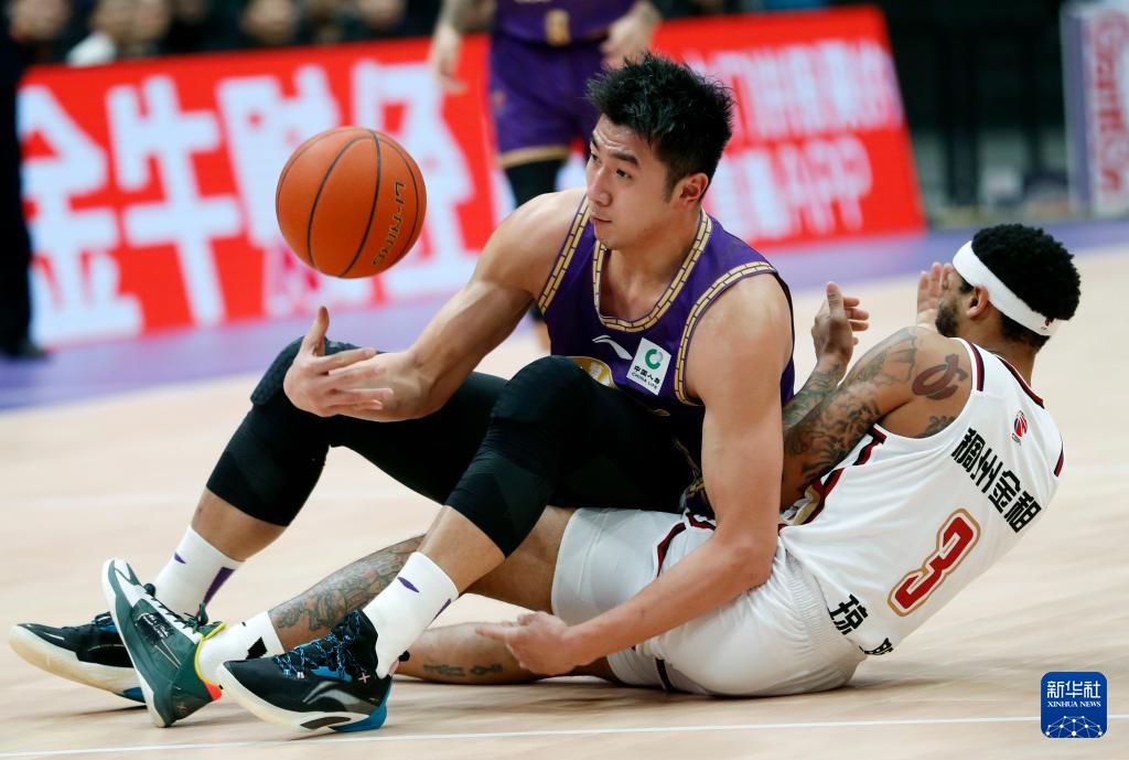 1月13日,北京控股队球员邹雨宸(左)与浙江稠州金租队球员琼斯倒地拼抢。新华社记者 雒圆 摄