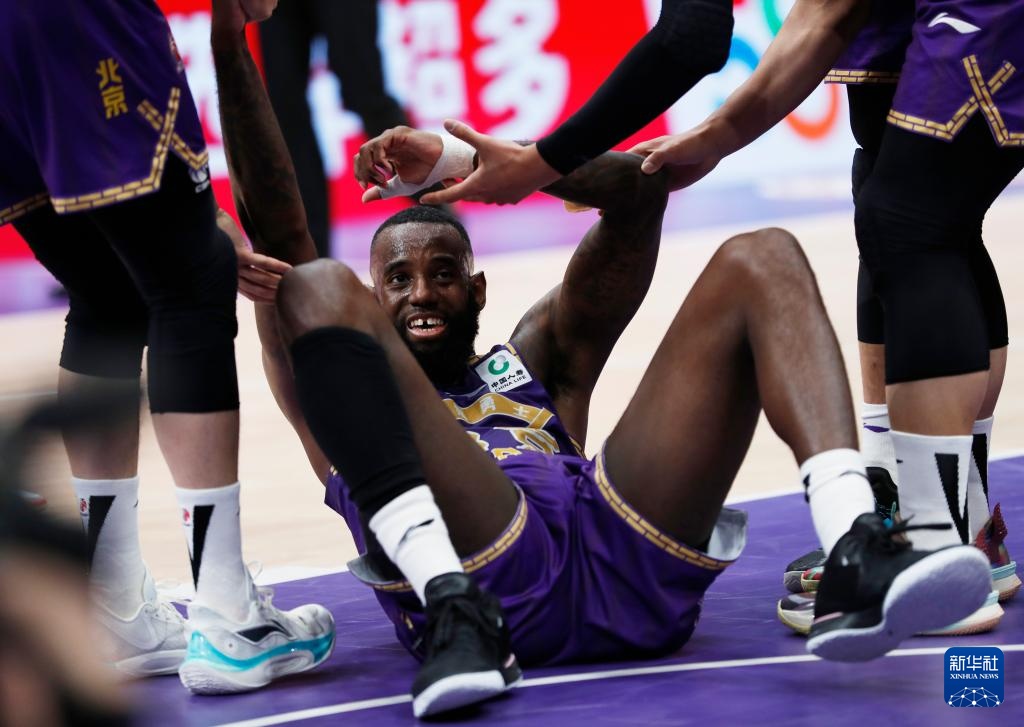 1月13日,北京控股队球员桑普森在比赛中倒地。新华社记者 雒圆 摄