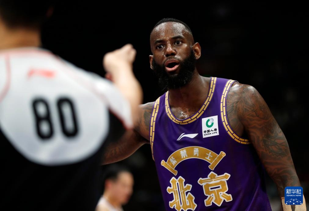 1月13日,北京控股队球员桑普森在比赛中和裁判交流。新华社记者 雒圆 摄