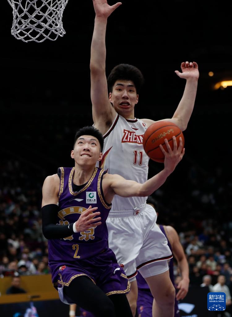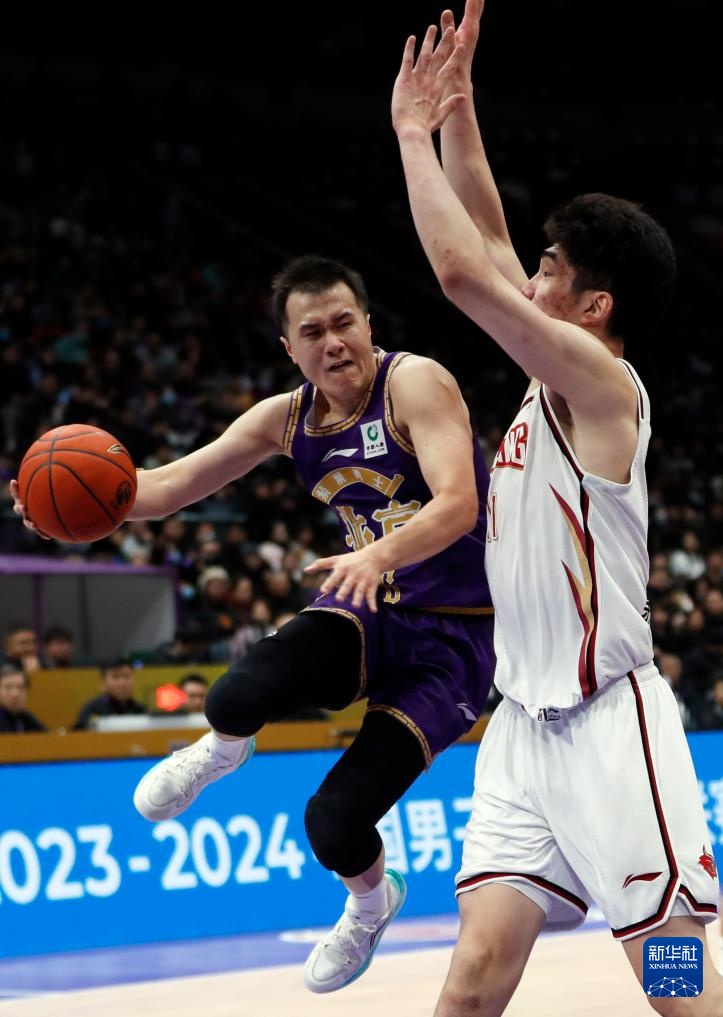 1月13日,北京控股队球员廖三宁(左)在比赛中上篮。新华社记者 雒圆 摄
