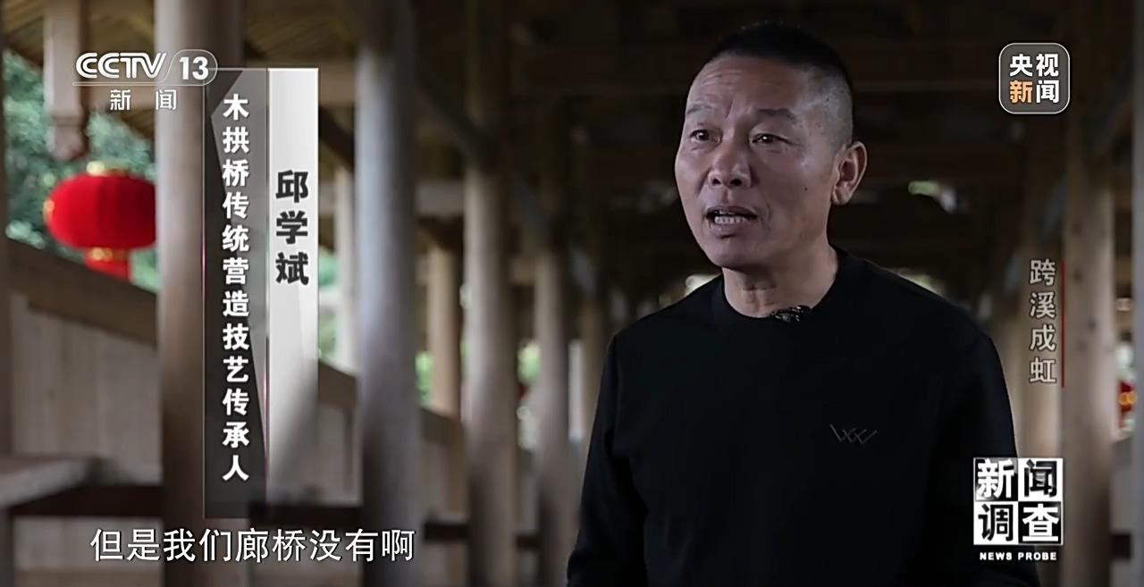 木拱桥传统营造技艺传承人 邱学斌:工程上国家正规里面有资质的施工方,还有监理等等一套完备的程序来保证这个桥的安全性,但是我们廊桥没有,只能靠经验的积累。