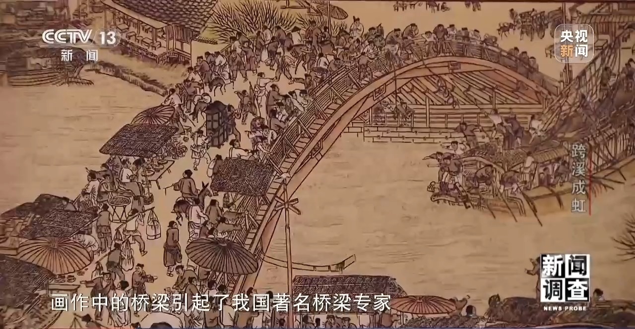 1953年11月,北宋著名画师张择端的《清明上河图》首次在北京故宫博物院面向公众展出。画作中的桥梁引起了我国著名桥梁专家,武汉长江大桥桥头堡设计者唐寰澄的注意。“那桥是一座非常别致轻盈的木拱桥。画上可以看到桥的每一部分细节的构造”。