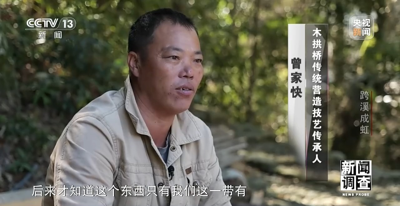 木拱桥传统营造技艺传承人 曾家快:那时候不讲传承,不讲非遗,我们这个老柴桥也没有什么稀奇的。后来才知道这个东西只有我们这一带有,但是存量也不多。应该一九九几年开始宣传,大家关注这些东西,我就想把它研究出来。