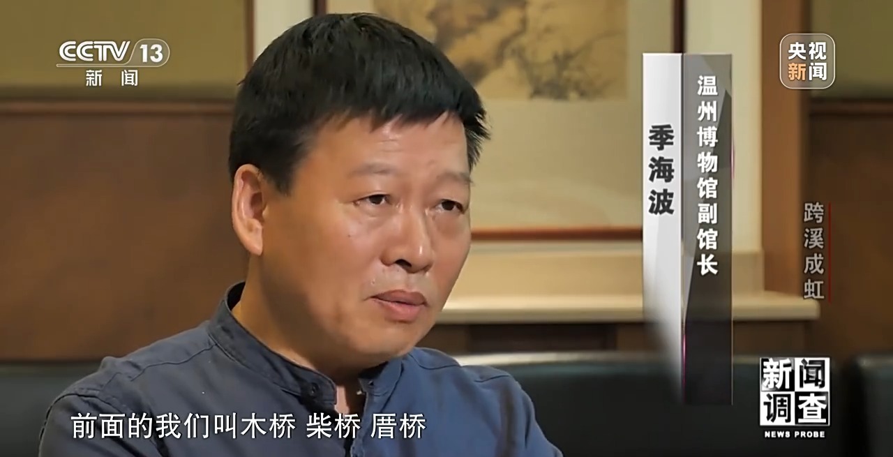 温州博物馆副馆长 季海波:廊桥概念是后来的,前面的我们叫木桥、柴桥、厝桥,作为木拱桥,至少到现在它是在整个世界上非常特殊的一个木构,非常具有我们中国特色的传统文化当中对于自然界的那种认知,并与之相和谐。它从来不是说把这个河给填掉,它是这个位置适合造这一种桥,那因此就横空跨越过去了。