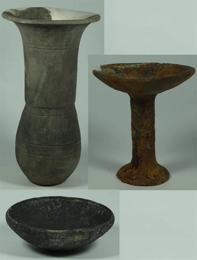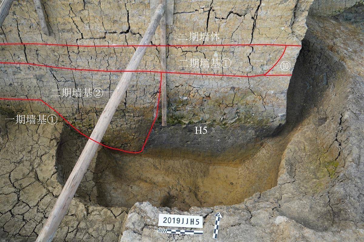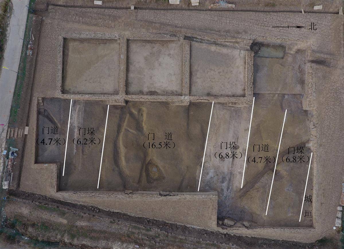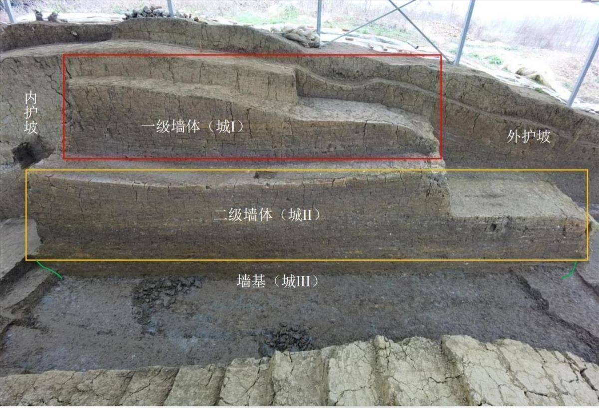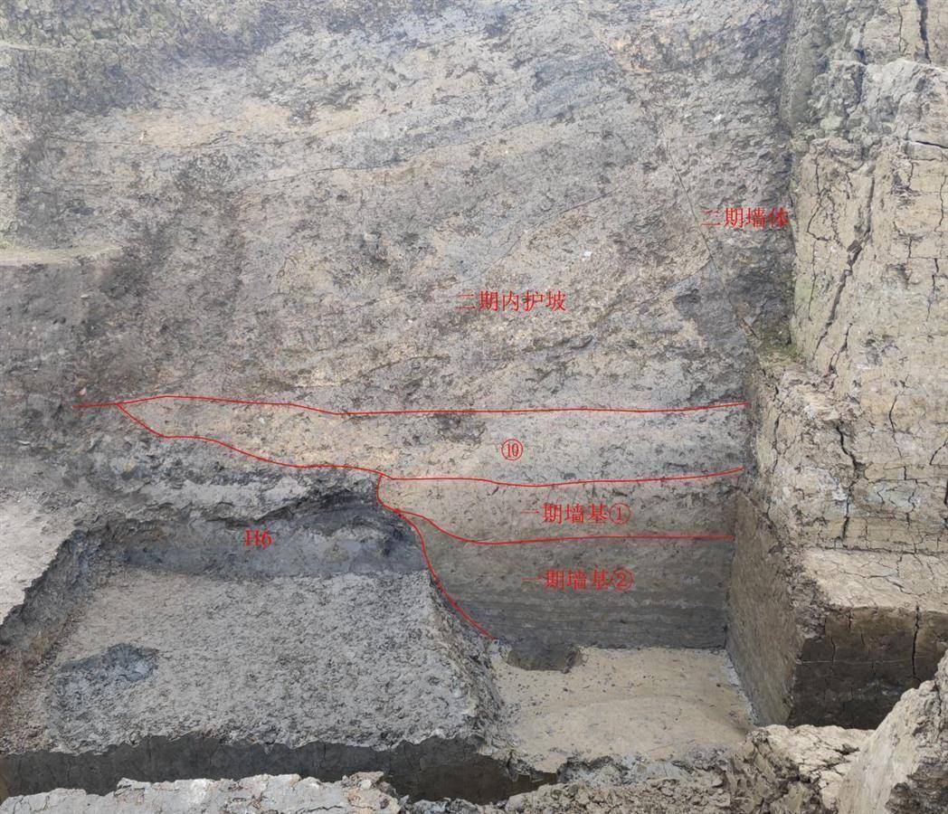 闻磊介绍,此次在对现有城垣发掘解剖时,发现其下往西错位约2米处有一道宽约12米的黄土堆积,较为纯净。继续进行解剖发掘,确认其为更早的城垣堆积。根据叠压关系将现有城垣遗存定为二期城墙,新发现的早期城垣遗存定为一期城墙。该遗存地层出土陶器可辨器形主要有盂、罐、豆、盆等,经对比分析,这些陶片的年代多为战国早期,也有少数属于春秋晚期,因此推测一期城墙的年代不晚于战国早期。