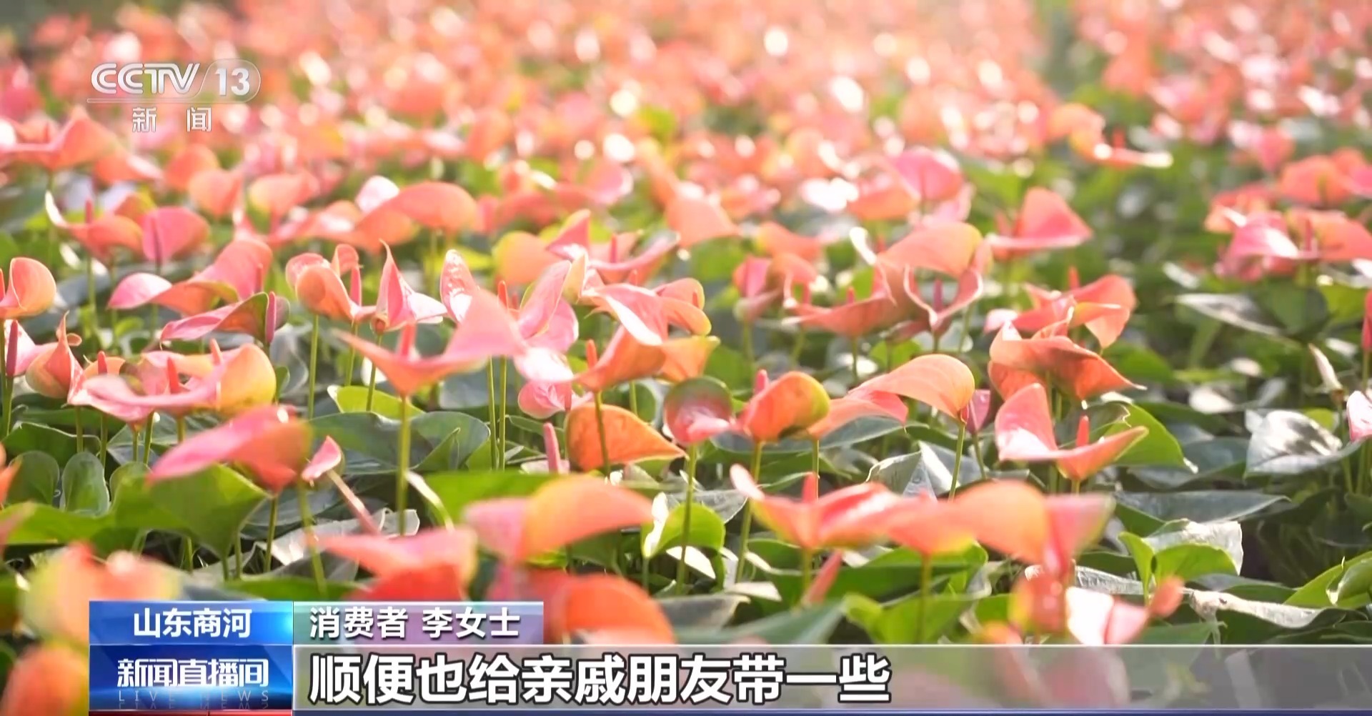 在山东济南市商河县的国家农业科技园区,智能温室大棚里一盆盆色彩艳丽的红掌汇成了花海。红掌寓意红红火火、一帆风顺,因此深受消费者的喜爱。