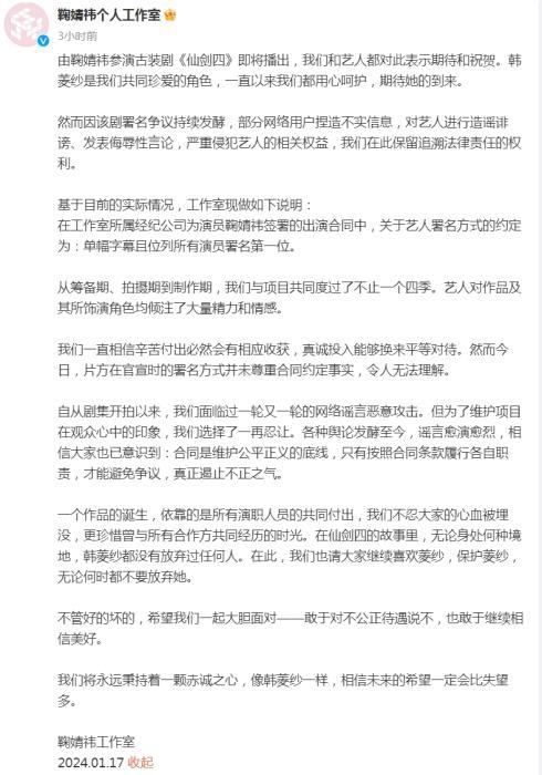 鞠婧祎工作室称:“在工作室所属经纪公司为演员鞠婧祎签署的出演合同中,关于艺人署名方式的约定为:单幅字幕且位列所有演员署名第一位。”